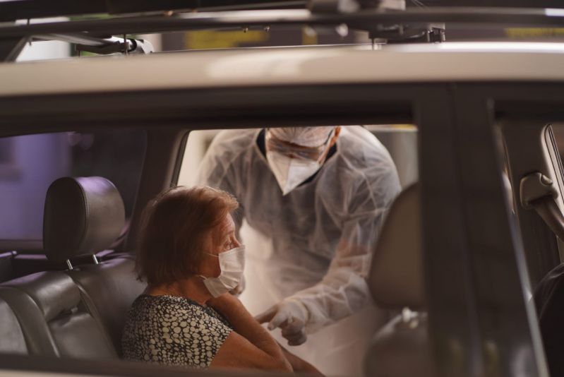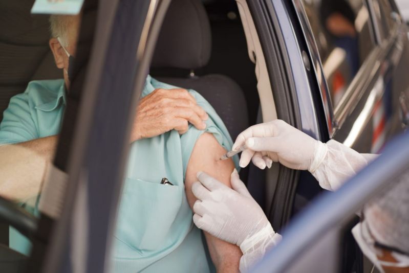 A equipe da Secretaria Municipal de Saúde vacinou, neste domingo (14), 150 idosos contra Covid-19, durante o drive-thru, na rua coberta, para idosos maiores de 78 anos.