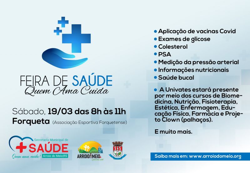 A Administração Municipal por meio da Secretaria de Saúde, promove no sábado, dia 19, a primeira edição da Feira de Saúde “Quem ama cuida”. A ação ocorre no Distrito de Forqueta, das 8h às 11h, na Associação Esportiva Forquetense e é aberta a toda comunidade.