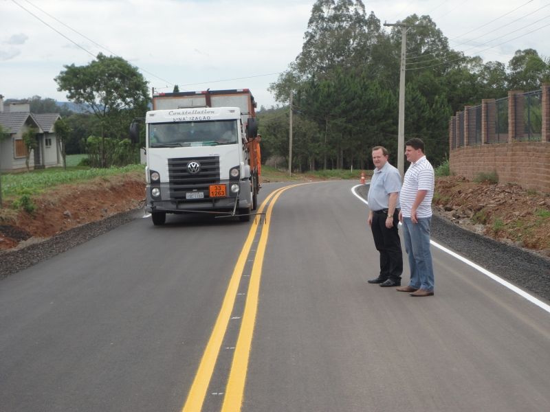 Foi executada essa semana a pintura da sinalização dos trechos asfaltados na Estrada Geral Arroio Grande e Estrada de acesso a Palmas Sul, nas localidades de Arroio Grande e Palmas, respectivamente. As pavimentações asfálticas foram executadas na primeira semana de outubro. Em Arroio Grande foram 1.060 metros de extensão de asfalto, partindo do ponto pavimentado no primeiro semestre do ano, até o entroncamento com a rua João Antônio Rauber, mais conhecido como o travessão que liga Arroio Grande à Rui Barbosa. O investimento é de R$ 885.241,70, provenientes de financiamento do município junto ao Badesul, somado à contrapartida do município. O primeiro trecho pavimentado corresponde a 720m de asfalto, partindo do bairro Bela Vista. O investimento foi de R$ 750 mil, via recurso de financiamento junto ao Badesul, com a participação dos moradores locais no pagamento da drenagem pluvial. Ainda está previsto um terceiro trecho de 840 metros de asfalto, que corresponde ao ponto do Travessão até a Casa Comercial Linck. No Distrito de Palmas foram 190 metros de pavimentação asfáltica na estrada de acesso a Palmas Sul/ São Roque, dando seqüência ao asfalto já existente no local. O investimento é de R$ 211.459,00, provenientes de uma emenda do Ministério das Cidades, no valor de R$ 98.200,00, somados à contrapartida do município. Legenda: Prefeito Sidnei Eckert e Secretário de Planejamento Henrique Meneghini acompanharam pintura da sinalização da Estrada Geral Arroio Grande. Fotos: Maica Viviane Gebing Texto: Assessoria de Imprensa