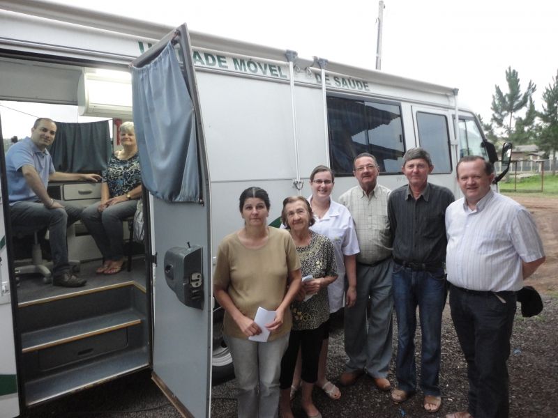 Mais de 1.400 pessoas foram atendidas na Unidade Móvel de Saúde durante o ano de 2012. Os dados são da Secretaria Municipal de Saúde e revelam que 992 pacientes procuraram os serviços da Unidade para atendimento médico, enquanto 448 receberam atendimento odontológico neste período. A Unidade Móvel de Saúde é um micro ônibus adaptado com equipamentos e condições apropriadas para a prestação de cuidados primários de saúde, consultas e procedimentos médicos e odontológicos, visando levar a saúde básica e preventiva para as comunidades do interior do município, geralmente mais distantes dos postos de saúde. A equipe responsável é composta por motorista, técnico de enfermagem, médico e dentista, que deslocam-se para as localidades, conforme agendamento prévio de roteiro realizado pela Secretaria. –Nosso principal objetivo é atender as pessoas que têm dificuldades de locomoverem-se até um de nossos postos de saúde, seja pela distância, transporte ou questões de saúde–, explica a Secretária Helena Matte. –Com esses atendimentos nas comunidades, conseguimos reforçar nosso foco da saúde preventiva, levando os cuidados básicos até o paciente–, complementa. Cumprindo seu roteiro itinerante, a equipe de saúde esteve na última semana nas localidades de São José de Palmas, Medianeira e Cascalheira. Moradoras da Medianeira, Dulce Führ e Iraci Goettens aproveitaram a oportunidade para colocar a saúde em dia. –É muito prático porque é pertinho de casa–, afirmou Dulce. –Sempre aproveito quando eles vêm. O atendimento é bom e não é preciso enfrentar fila–, destaca Iraci. Durante os meses de janeiro e fevereiro a Unidade Móvel pausa os atendimentos para realizar a manutenção do veículo e por causa do período de férias da equipe, retornando em março com o roteiro itinerante que está sendo montado pela Secretaria de Saúde. Legenda: Prefeito Sidnei Eckert e parte da equipe de profissionais da saúde em atendimento a moradores da localidade da Medianeira. Fotos: Maica Viviane Gebing Texto: Assessoria de Imprensa