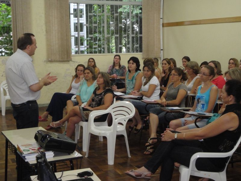 Professores alfabetizadores dos 1º, 2º e 3º anos do Ensino Fundamental e diretoras da rede municipal de ensino estiveram reunidos na última sexta-feira, dia 15, na Secretaria de Educação e Cultura, junto ao Prefeito Sidnei Eckert, Secretária Eluise Hammes e equipe, para o lançamento oficial do Pacto Nacional pela Alfabetização na Idade Certa (PNAIC). Trata-se de um programa do Governo Federal, por meio do Ministério da Educação (MEC), em parceria com o município, cujo principal objetivo é garantir a alfabetização de todas as crianças até os oito anos de idade. Para isso, o governo aportará incentivos financeiros e assistência técnica e pedagógica para a formação especializada dos professores alfabetizadores, além de distribuir livros e jogos didáticos voltados para a alfabetização. De acordo com o MEC, a iniciativa partiu dos dados levantados pelo Censo 2010, que indica que 15,2% das crianças brasileiras em idade escolar não sabem ler, nem escrever. A formação dos profissionais iniciou em dezembro passado, com a capacitação de duas orientadoras de estudo que coordenarão encontros mensais com as educadoras envolvidas, somando 120 horas de formação continuada durante o ano. As técnicas de ensino serão inseridas no conteúdo escolar. Este ano o trabalho será voltado para a Linguagem e em 2014 será o ano da Matemática. Mais de 5.300 municípios brasileiros aderiram ao PNAIC. Legenda: Prefeito Sidnei Eckert conversou com professoras alfabetizadoras sobre a importância do PNAIC. Fotos: Maica Viviane Gebing Texto: Assessoria de Imprensa