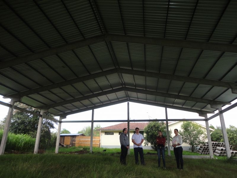 A quadra de esportes localizada ao lado da Escola Municipal de Ensino Fundamental (EMEF) Construindo o Saber, bairro Navegantes, recebeu cobertura na última semana, concluindo mais uma etapa da obra. A quadra beneficia especialmente os alunos da Escola e começou a ser construída em julho de 2012. Após um breve período paralisada, em função do atraso de repasses financeiros federais e pela demora na fabricação dos pré-moldados, a obra já ilumina os olhares da comunidade escolar, faltando apenas a concretagem do piso, instalação de equipamentos e demarcações para sua conclusão. A quadra de esportes terá 814m², num investimento de R$ 197.547,50, sendo R$ 97.500,00 provenientes de emenda parlamentar do Deputado Federal Vilson Covatti, somados à contrapartida do município. O projeto prevê estrutura pré-moldada e cobertura, incluindo piso polido, goleiras para a prática de futebol, redes para voleibol e cestas para basquete, além das demarcações necessárias para as devidas atividades e rede de proteção ao redor da quadra. Desde 2009 a administração municipal vem investindo em quadras de esportes, como forma de incentivo às práticas saudáveis, tendo beneficiado os Distritos de Palmas e Forqueta, além do bairro São Caetano. A diretora da EMEF Construindo o Saber, Márcia Thomé, afirma que a construção da quadra é a realização de um sonho e atende à necessidade de proporcionar um local seguro para os alunos praticarem esportes e outras atividades. –Agora podemos ver a concretização desse projeto. Estamos ansiosos para utilizar o novo espaço–, comemora. Legenda: Prefeito Sidnei Eckert, Diretora da Escola, Márcia Thomé e Secretários de Educação e Planejamento, Eluise Hammes e Henrique Meneghini, acompanham andamento da obra. Fotos: Maica Viviane Gebing Texto: Assessoria de Imprensa