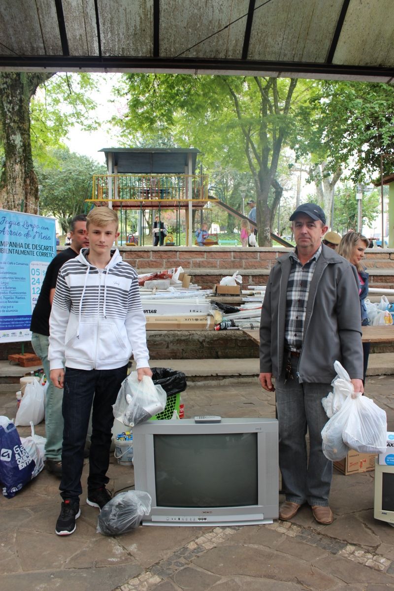 Em sua 12ª edição, a Campanha de Descarte Ambientalmente Correto Jogue Limpo com Arroio do Meio registrou o recolhimento de cerca de 990 eletroeletrônicos, 830 lâmpadas fluorescentes, 406 vidros de café e conserva, 205 litros de óleo de cozinha, 45 quilos de pilhas e baterias, 15 quilos de medicamentos vencidos e sete sucatas. O evento aconteceu na manhã do último sábado, 5, na Rua de Eventos, e contou com a participação de centenas de pessoas que praticaram sua consciência ambiental, realizando o descarte adequado de resíduos inutilizáveis. Um dos bons exemplos veio do agricultor de Picada Arroio do Meio, Nilo Paulo Friedrich, 52, que, acompanhado do filho adolescente, Gustavo Henrique, 14, descartou uma televisão, ferro elétrico, secador de cabelo, telefone, fones de ouvido, lâmpadas e vidros de conserva. –Fomos guardando e agora resolvemos aproveitar a oportunidade–, afirmam. –Vemos muito lixo atirado nas roças–, lamentam. –Não podemos descartar esses materiais no meio ambiente–, recomendam. De acordo com o Coordenador do Departamento do Meio Ambiente, Paulo Henrique Rubim Barbosa, a massiva participação da comunidade surpreende a cada edição da campanha, comprovando o crescimento da conscientização e a importância de orientar e oportunizar uma forma correta do descarte, sem agressão à natureza. –São toneladas de resíduos encaminhados para reciclagem, reaproveitamento e descarte apropriados, o que beneficia a sociedade como um todo, já que este material deixa de contaminar o solo, o lençol freático, rios e arroios–, explica. O recolhimento do material é realizado por empresas especializadas no ramo, parceiras do município na causa. Saiba mais: Dentre os 990 eletroeletrônicos, destaque para: 258 celulares; 98 televisores; 59 carregadores de celular; 47 rádios; 40 monitores; 38 teclados; 32 controles de TV; 29 impressoras; 24 caixas de som; 23 mouses, entre outros. Mais exemplo de consciência e responsabilidade: Próximo ao Jogue Limpo com Arroio do Meio, a Associação de Proteção aos Animais Arroio-meenses (APAAM) realizava uma exposição de cães para adoção. O sortudo da manhã foi Apolo, de apenas quatro meses. O pequeno cão foi adotado pelo jovem Marçal Rahmeier, 27, e levado à sua nova moradia, em Palmas, onde assumirá o posto de guarda da empresa e da residência da família. A APAAM está sediada na rua Dom Pedro II, Centro, fundos do Parque Municipal de Máquinas. No local existem cerca de 70 cães abandonados disponíveis para adoção. A partir de um projeto do Poder Executivo, em parceria com voluntários e médico veterinário responsável, todos os cães para adoção foram castrados, facilitando a tutela responsável. Legenda: Pai e filho fizeram questão de participar juntos da campanha de descarte; Fotos: Maica Viviane Gebing Texto: Assessoria de Imprensa