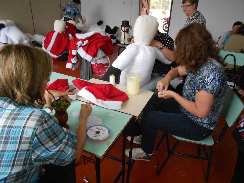 ARROIO DO MEIO – Em espírito de amizade e cooperação, as voluntárias lideradas pelas Associação das Artesãs, Núcleo Municipal de Cultura e Centro de Referência da Assistência Social (CRAS), trabalham na confecção de papais noéis e enfeites para a decoração natalina do município. A união de esforços da Administração Municipal e comunidade resultará em 22 papais noeis e 22 bengalas, a serem instaladas nas estruturas metálicas da Rua de Eventos, tornando-a a Rua do Papai Noel. Para a fase de acabamento dos enfeites, está sendo feito um novo chamamento à comunidade, para a participação voluntária no projeto. Pessoas interessadas podem auxiliar nos grupos de trabalho nos seguintes horários: Segunda-feira, dia 09, das 14h às 17h e na quarta-feira, dia 11, das 19h às 22h. Os encontros ocorrem no Centro Social - Comunidade Luterana São Paulo – rua Martin Luther King, 458, Centro. Mais informações na Casa do Museu, pelo fone (51) 3716 1166 ramal 211. Legenda: Voluntárias encontram-se semanalmente no Centro Social para a produção da decoração natalina da Rua de Eventos. Fotos: Angelica Diefenthaler Texto: Assessoria de Imprensa