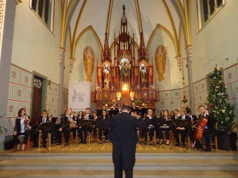ARROIO DO MEIO – Integrando os festejos natalinos do município, a Administração Municipal e o Núcleo de Cultura promovem na próxima quinta-feira, 17, a tradicional Caminhada Natalina. Este ano com novidades, a caminhada inicia às 20h, na Igreja Matriz, com concerto natalino da Orquestra Jovem do SESI e participação do Coral Municipal de Arroio do Meio, sob regência de Adriano Prediger. Sob a batuta do maestro Edson Wietholter, a orquestra promete emocionar, mesclando clássicos e natalinos em seu repertório. Ao final do concerto, conduzidos pela Sagrada Família, o público segue cantando em caminhada luminosa até o Hospital São José, onde ocorre a Benção da Saúde. O cortejo prossegue pela rua São João até a prefeitura, onde ocorre encenação do Auto de Natal, com o grupo FoiceAcena, sob direção de Iselda Pelison. O evento encerra com show de fogos. Incentivando a convivência familiar e comunitária, a comunidade é convidada a trajar branco, caminhar e cantar celebrando a vida e invocando a paz no mundo. Os adultos podem trazer velas para a caminhada luminosa. Neste ano, a Sagrada Família será representada pelo casal Estevão e Helena Seibel Storck e a pequena Ester, integrantes do grupo Frohsinn, de Forqueta, participantes do Núcleo Municipal de Cultura, além dos Reis Magos da comunidade da Barra do Forqueta. A iniciativa conta com a participação das igrejas católica e luterana nas celebrações de benção. Os festejos natalinos encerram dia 19, às 21h, com o concerto de Natal na Igreja de Pedra, em Forqueta, com o Coral Municipal de Encantado. Legenda: Caminhada desse ano inicia na Igreja Matriz, com a Orquestra Jovem do SESI. Fotos: Maica Viviane Gebing/Arquivo Texto: Assessoria de Imprensa