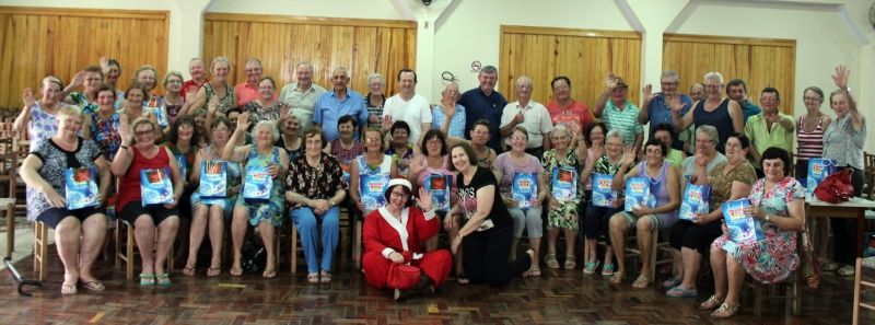 ARROIO DO MEIO – Com o objetivo de levar uma mensagem natalina e de agradecimento aos idosos arroio-meenses, a administração municipal organizou um roteiro de visitação aos 20 grupos da Terceira Idade do município. Guiados pela Mamãe Noel, interpretada pela servidora pública Adiles Meyer, o Prefeito Sidnei Eckert, vice Áurio Scherer, Coordenadora do Departamento da Terceira Idade, Noely Herrmann e servidora Luise Nos, foram ao encontro dos grupos e distribuíram lembranças acompanhadas de abraços e desejos de Feliz Natal e próspero 2016. Os encontros aconteceram ao longo do mês de dezembro, de acordo com as agendas de confraternização e encerramento das atividades dos grupos. –É um momento em que nos abraçamos, trocamos afeto e carinho com nossos amigos da Terceira Idade–, afirma Noely. Além dos grupos distribuídos pelas comunidades do interior, Centro e bairros, a comitiva realizou ainda uma visita aos idosos da Associação Arroio-meense de Amparo ao Idoso (Amai). Para Eckert, os encontros são motivo de alegria e satisfação. –Momento em que os idosos se reúnem e conversam, recordam a infância e se emocionam. Já fizeram tanto pelo nosso município, agora é hora de retribuir–, afirma. –Tempo de reflexão e espiritualidade, que o ano novo seja de muita saúde, alegrias, esperança e fé–, desejou Eckert aos idosos. Arroio do Meio possui aproximadamente três mil idosos. Destes, cerca de 1.500 estão associados a grupos de Terceira Idade, participantes e promotores de reuniões, bailes e almoços mensais que contam com apoio da Administração Municipal. Durante o ano, atividades de saúde preventiva, dança sênior, inclusão digital, jogos inteligentes e exercícios físicos orientados são oferecidas aos idosos, numa forma de estimular o envelhecimento com qualidade de vida, saúde e bem-estar. Legenda: Mamãe Noel e equipe da administração municipal levam mensagem de Natal aos 20 grupos da Terceira Idade do município. Fotos: Maica Viviane Gebing Texto: Assessoria de Imprensa