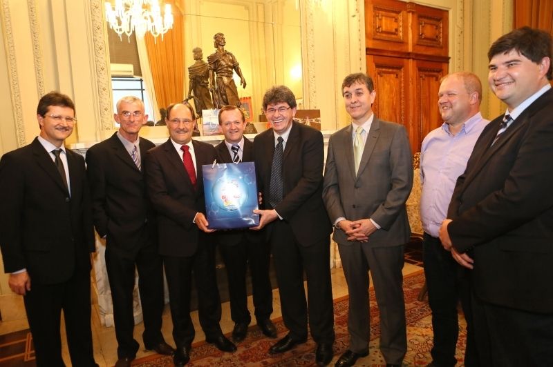 ARROIO DO MEIO – Uma comitiva de Arroio do Meio, liderada pelo Prefeito Sidnei Eckert, reuniu-se com o Governador José Ivo Sartori na tarde da quarta-feira, 9, no Palácio do Piratini. O motivo do encontro foi o convite ao Governador para a inauguração do novo complexo da indústria de produtos de limpeza Girando Sol, a realizar-se dia 1º de abril, data em que a Girando Sol comemora 25 anos de atividades no Município. O convite foi entregue pelo diretor presidente da indústria, Gilmar Borscheid, junto a amostras de produtos. Participaram ainda do encontro o deputado estadual Edson Brum, secretários municipais, Marcelo Schneider e Klaus Werner Schnack, e os diretores da Girando Sol, Pedro Schweizer e José Schulze. O grupo ficou impressionado com a forma simples e acolhedora com que foi recebido por Sartori. –É um orgulho muito grande para Arroio do Meio ter uma indústria com a história e o reconhecimento da Girando Sol–, comemora Eckert. Legenda: Representantes de Arroio do Meio entregam convite dos 25 anos da Girando Sol para Governador Sartori. Fotos: Luiz Chaves/Palácio Piratini Texto: Assessoria de Imprensa/Prefeitura de Arroio do Meio