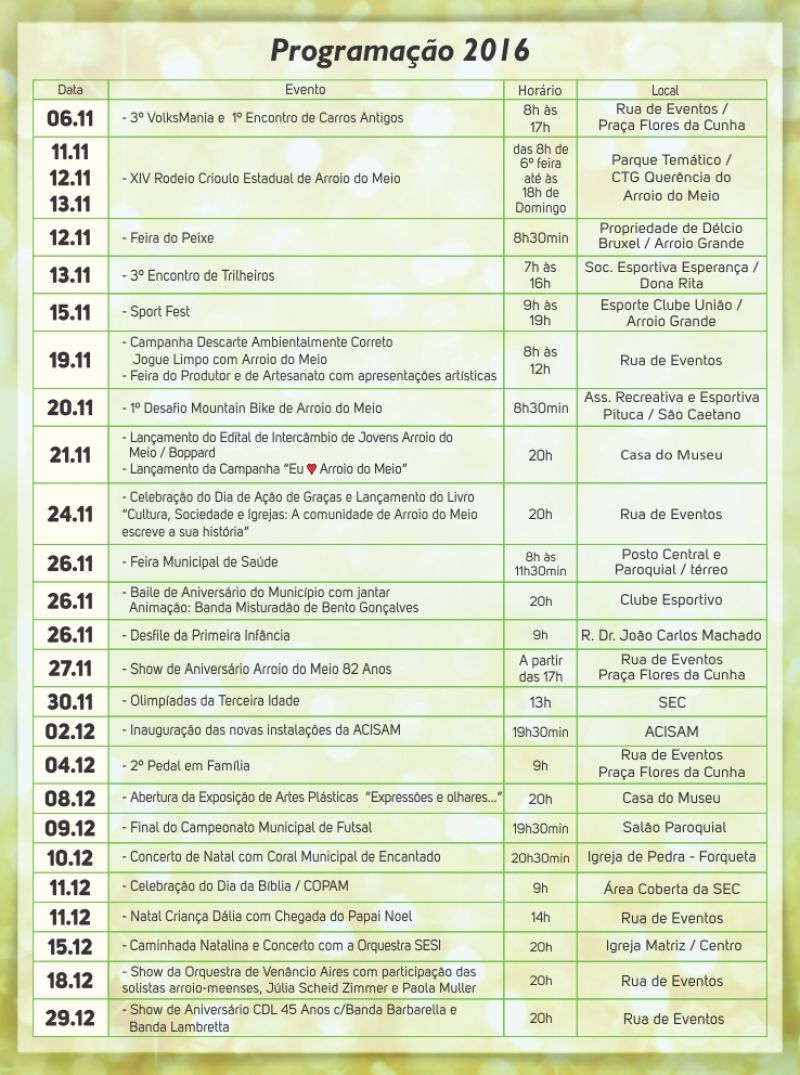 ARROIO DO MEIO – Depois do sucesso da 3º Volksmania/1º Encontro de carros antigos, ocorrido no último domingo, 6, no Centro, a programação de Aniversário do Município segue neste final de semana, quando ocorre o XIV Rodeio Crioulo Estadual (sexta a domingo - 11 a 13), no CTG Querência do Arroio do Meio; Feira do Peixe (sábado, 12, 8h30min), na propriedade de Délcio Bruxel, em Arroio Grande; e 3º Encontro de Trilheiros (domingo, 13), com concentração na Sociedade Esportiva Esperança, em Dona Rita.