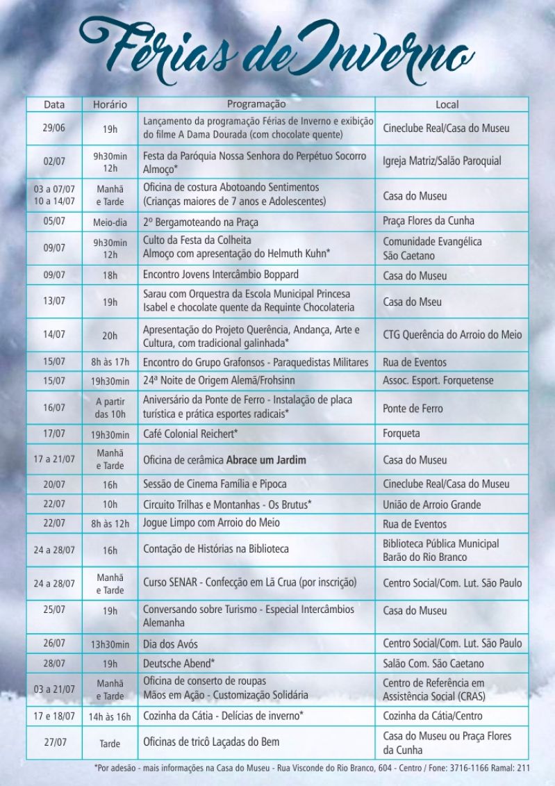 O Programa Férias de Inverno foi lançado em 29 de junho, junto à sessão do Cineclube Real. A programação segue durante todo o mês de julho e contempla festas comunitárias, oficinas de artesanato, atividades na biblioteca, gastronomia, esporte, cultura, sarau, entre outros. A realização é da Administração Municipal Arroio do Meio, Comunidade e Família, Grupo Conversando sobre Turismo, Casa do Museu e Núcleo Municipal de Cultura, com apoio de comunidades e empreendedores envolvidos.