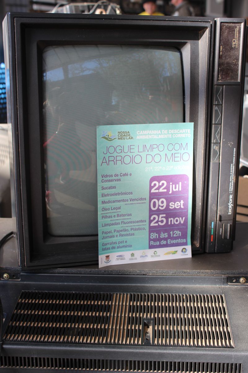 ARROIO DO MEIO – Mais de 900 eletroeletrônicos foram descartados pela comunidade na manhã do último sábado, 22, na Rua de Eventos, durante a 21ª edição da Campanha de Descarte Ambientalmente Correto Jogue Limpo com Arroio do Meio. Outros itens recolhidos foram lâmpadas fluorescentes – 715 unidades; óleo de cozinha – 190 litros; vidros de café e conserva – 300 unidades; pilhas e baterias – 37 quilos; medicamentos vencidos – 20 quilos; papel, papelão, plásticos e garrafas pet – 400 kg e sucatas - 10.