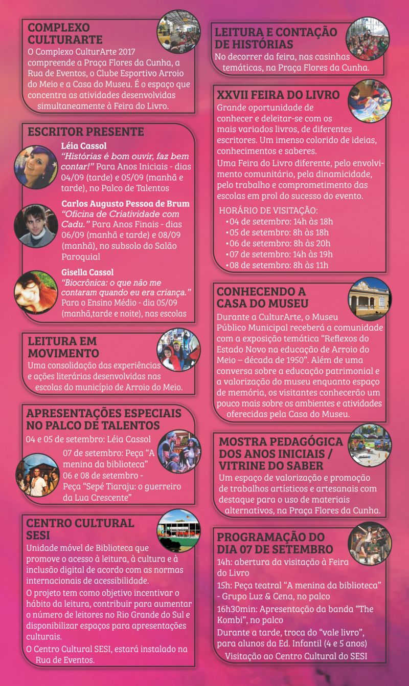 No feriado da quinta-feira, 7 de setembro, uma programação especial está confirmada para toda a família, a partir das 14h, com visitação à Feira instalada no Clube Esportivo e demais exposições no entorno do Complexo CulturArte. Os destaques da tarde serão a peça teatral “A menina da Biblioteca”, do Grupo Luz e Cena, às 15h, e apresentação da banda The Kombi, às 16h30min, ambos no palco instalado na Rua de Eventos.