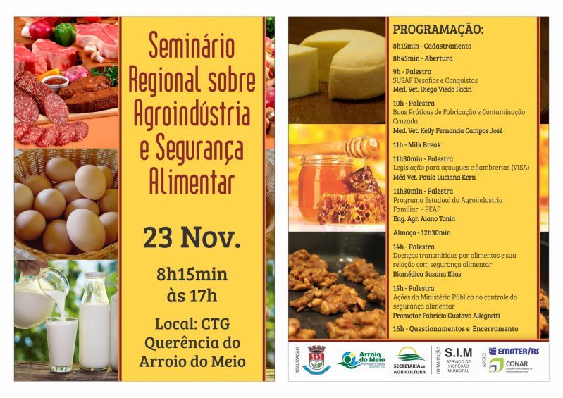 A próxima semana será especial para o Setor Primário, com dois eventos realizados em dias consecutivos. Na quarta-feira, 22, ocorre a 1ª Feira Agrícola de Arroio do Meio, das 9h às 17h, na Subprefeitura de Forqueta. Além da exposição de máquinas e equipamentos agrícolas, o dia será composto por palestras sobre Agricultura de Precisão, Saúde do Homem, Impacto do uso de águas subterrâneas na agricultura moderna e nota fiscal eletrônica. Haverá também serviços de saúde, mateada, apresentação de pesquisa da Escola do Distrito, demonstração de regulagem de pulverizadores e sorteio de brindes entre os participantes. A programação segue na quinta-feira, 23, quando será realizado o Seminário Regional sobre Agroindústria e Segurança Alimentar, das 8h às 17h, no CTG Querência. Seis palestras estão programadas ao longo do dia, ministradas por médicos veterinários, engenheiro agrônomo, biomédica e promotor. (Confira programação completa no quadro abaixo).