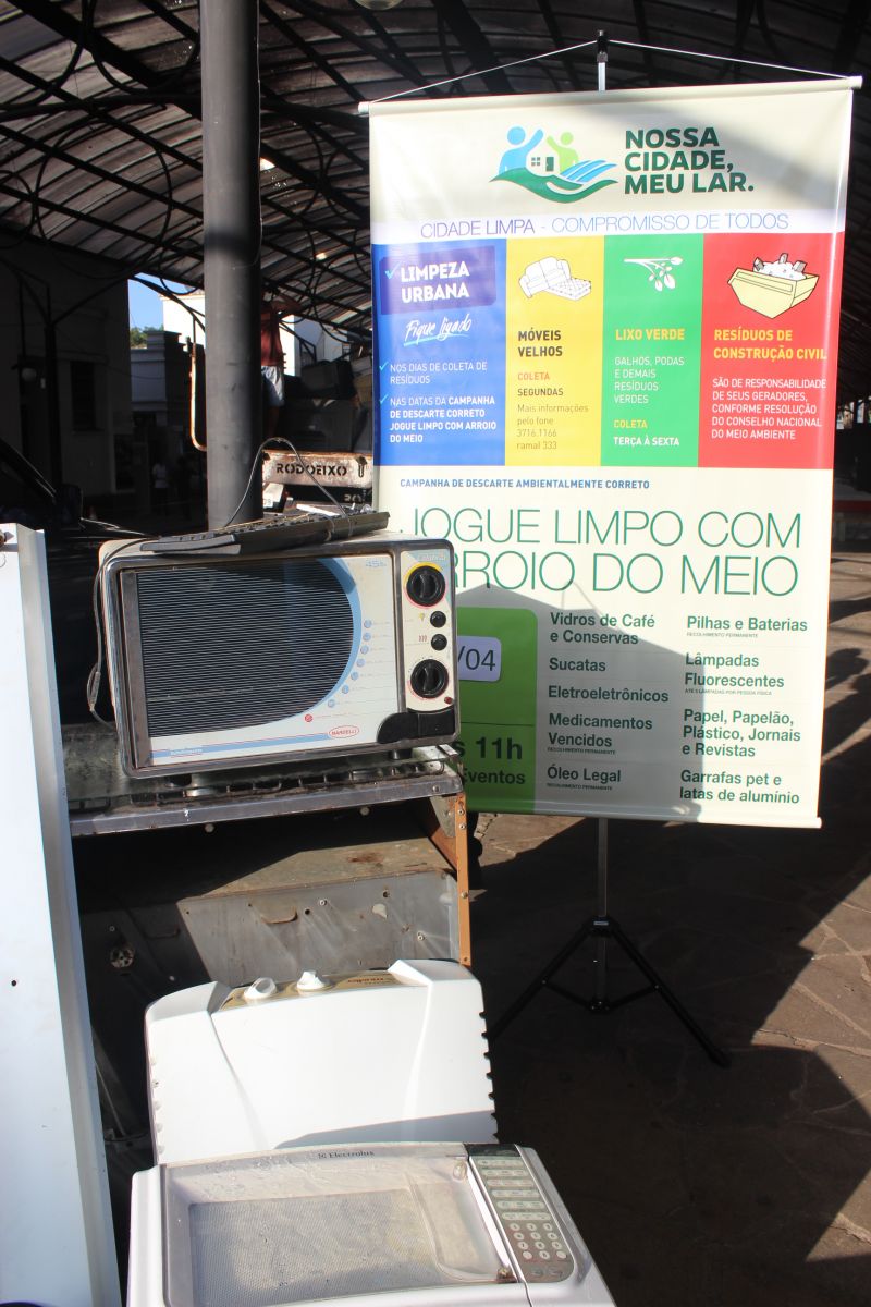 ARROIO DO MEIO – A Administração Municipal realizou a 25ª edição da Campanha de Descarte Ambientalmente Correto Jogue Limpo com Arroio do Meio na manhã do último sábado, 7, na Rua de Eventos. Na ocasião foram recolhidos 763 eletroeletrônicos, 531 lâmpadas fluorescentes, 310 litros de óleo de cozinha, 200 vidros de café e conservas, 62 quilos de pilhas e baterias, 12 quilos de medicamentos vencidos, 800 quilos de papel, papelão, jornais, livros, plásticos e garrafas pet e 15 unidades de sucatas.