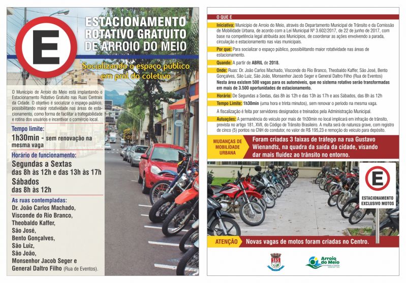 A orientação será realizada por servidores municipais, com um período educativo de 60 dias. Para facilitar a rotina dos trabalhadores do Centro – comércio, instituições bancárias, setor público e escolas, o Município viabilizou áreas alternativas para o estacionamento de veículos que permanecem o dia todo na área central, por meio de parcerias com proprietários de terrenos. Até o momento são seis espaços: Rua Visconde do Rio Branco – em frente à loja LS Confecções e ao lado da Lancheria do Dani; Rua Bento Gonçalves – Quadra em frente à Escola Guararapes/fundos da Secretaria de Educação e Cultura; Rua São João - na entrada da Área de Lazer; Rua Dr. João C. Machado – ao lado da Rodoviária e Rua Maurício Cardoso, próximo ao Supermercado Arroio-meense. Além disso, foram criadas novas vagas para estacionamento de motos, em frente à Secretaria Municipal de Educação e Cultura – rua Dr. João Carlos Machado.