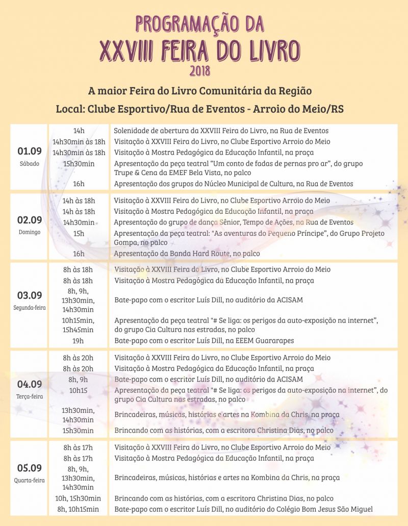 ARROIO DO MEIO – Toda a comunidade está convidada a prestigiar a abertura oficial da 28ª Feira do Livro de Arroio do Meio, a realizar-se no sábado, 1º de setembro, às 14h, na Rua de Eventos. Ao longo da tarde haverá apresentação da peça teatral “Um conto de pernas pro ar”, do grupo Trupe & Cena, da Escola Municipal Bela Vista, além da participação dos grupos do Núcleo Municipal de Cultura, com dança e música para animar a Rua de Eventos. Logo após a abertura oficial, o Clube Esportivo estará disponível para visitação à Feira, até às 18h.