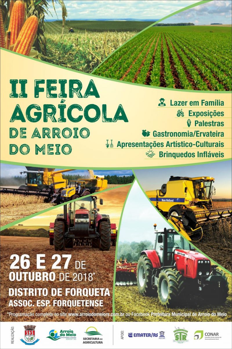 ARROIO DO MEIO – A Administração Municipal convida toda a comunidade local e regional para prestigiar a II Feira Agrícola, que ocorre sexta-feira e sábado, dias 26 e 27 de outubro, no Distrito de Forqueta. Vinte e sete expositores estão confirmados para os dois dias de Feira, incluindo agropecuárias, empreendimentos de maquinários, implementos, manutenção e revenda de máquinas agrícolas.