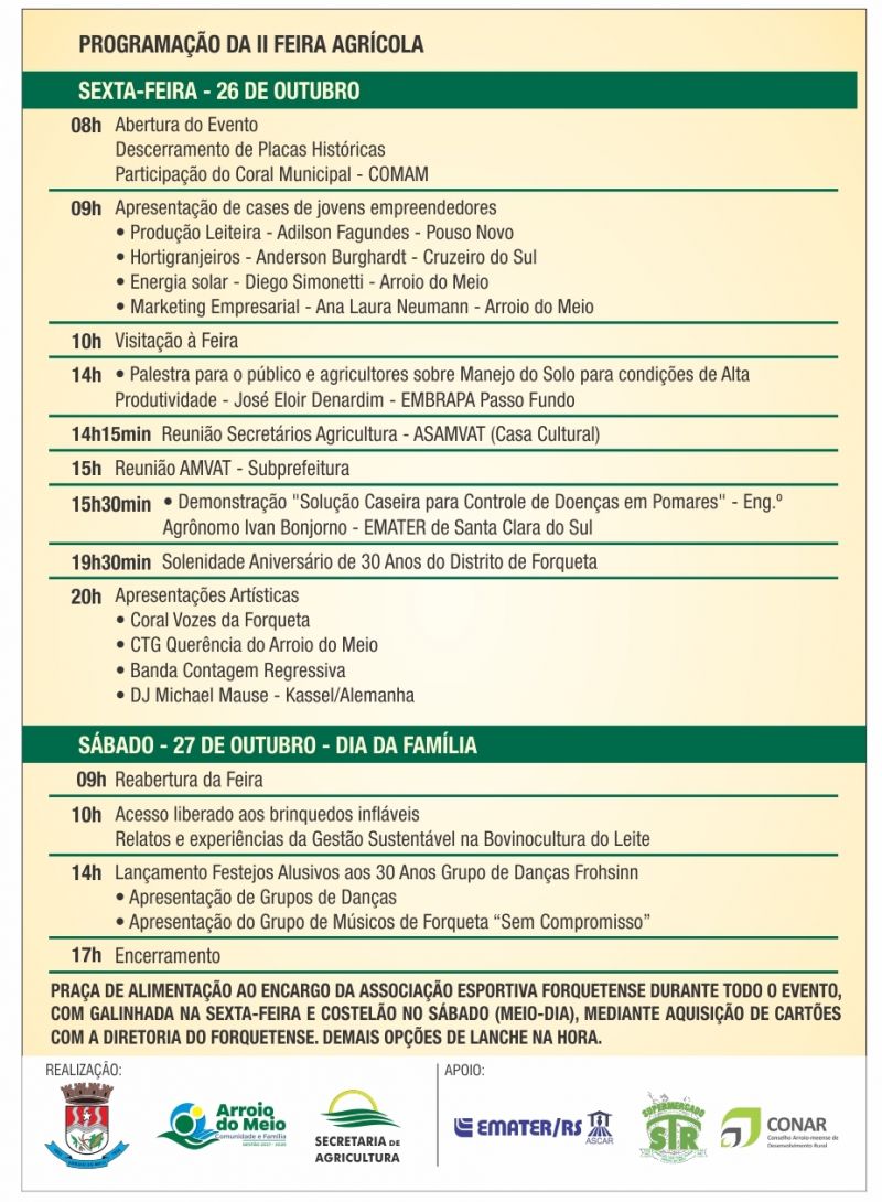 A abertura do evento será sexta-feira, 26, às 8h, com solenidade oficial e participação do Coral Municipal. Para às 9h está programada a apresentação de quatro cases de jovens empreendedores rurais e urbanos. A tarde segue com palestras ministradas por técnicos da Embrapa e Emater e encontros regionais com Prefeitos e Secretários da Agricultura dos Municípios vizinhos. Para a noite, a partir das 19h30min, está programada a solenidade de Aniversário de 30 anos do Distrito de Forqueta, com homenagem aos ex subprefeitos e comunidade local. Logo após, apresentações artísticas com Coral Vozes de Forqueta, CTG Querência, Banda Contagem Regressiva e DJ alemão Michael Maus.