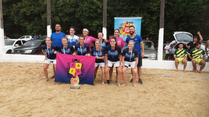 equipes masculinas e três femininas disputando o Beach Soccer, mais 12 duplas