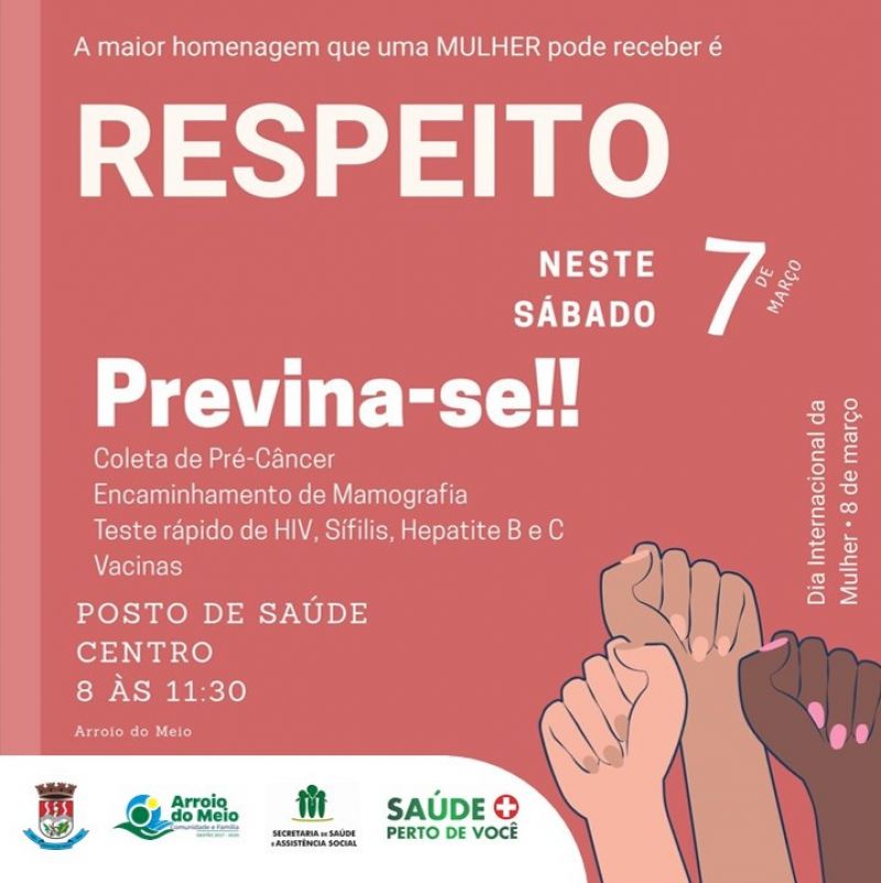 Em homenagem ao Dia Internacional da Mulher, comemorado em 8 de março, serão oferecidos exames de saúde preventiva para as mulheres, com coleta de pré-câncer, encaminhamento de mamografia, aplicação de vacinas e testes rápidos de HIV, Sífilis, Hepatites B e C. Interessadas devem ir até o posto do Centro com documento de identificação e carteirinha do Sistema Único de Saúde – SUS.