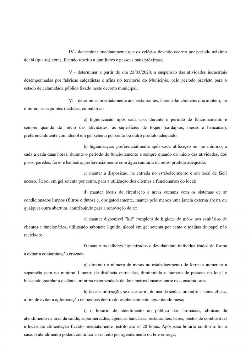 COMÉRCIO, ESCOLAS E INDÚSTRIA: A partir de segunda-feira, 23, estão proibidas as atividades e serviços privados não essenciais, com fechamento de lojas, academias, casas de festas e ginásios esportivos. Da mesma forma, o fechamento total de escolas, indústrias calçadistas e afins. Seguem funcionando farmácias, clínicas de atendimento de saúde, mercados, padarias, agências bancárias, lotéricas, restaurantes, postos de combustível e locais de alimentação desses espaços, respeitando o limite de horário até às 20h e regras básicas de higienização detalhadas no decreto.