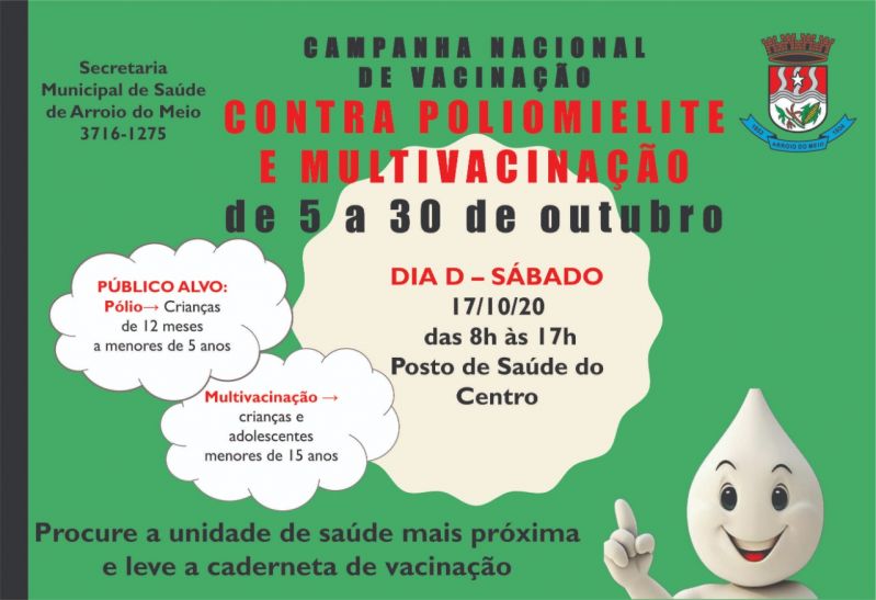 O grupo alvo da vacinação contra a poliomielite são as crianças de 12 meses a menores de 5 anos de idade (4 anos, 11 meses e 29 dias). Na multivacinação, o público alvo são as crianças e adolescentes menores de 15 anos de idade (14 anos, 11 meses e 29 dias). Durante todo o período da campanha, os munícipes podem procurar as unidades de saúde dos bairros - ESFs Navegantes, Aimoré, Bela Vista, São Caetano, Rui Barbosa e Posto de Saúde Central -, de segunda a sexta-feira, no horário de atendimento das unidades. Serão ofertadas todas as vacinas do calendário básico, visando reduzir as taxas de abandono, diminuir a incidência das doenças imunopreveníveis, oportunizar o acesso às vacinas, atualizar a situação vacinal e melhorar as coberturas vacinais.