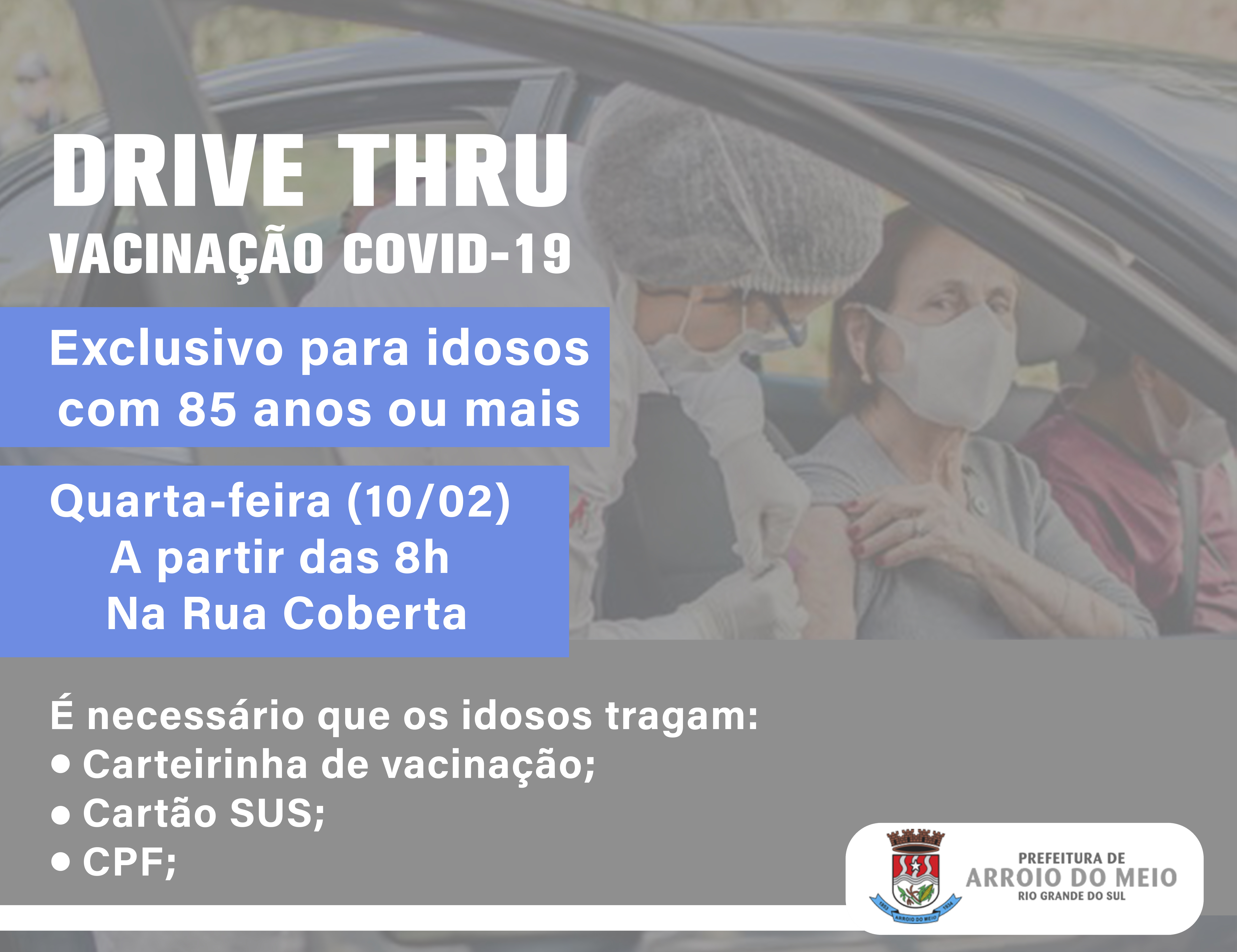 Para evitar aglomeração e para deixar os idosos em conforto e segurança, a Secretaria Municipal da Saúde está organizando a vacinação no estilo Drive Thru, onde a pessoa permanece dentro do carro, seguindo a fila. Será na Rua Coberta (Rua Daltro Filho) a partir das 8h, por ordem de chegada, até acabar o primeiro lote das doses.