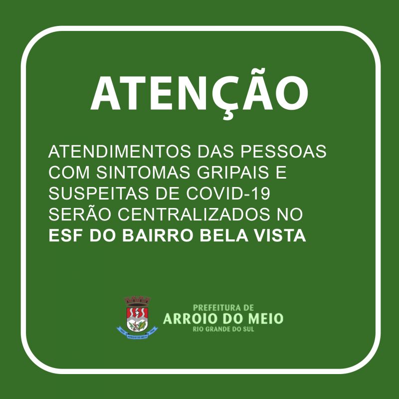 Considerando o agravamento do cenário, os atendimentos das pessoas com sintomas gripais e suspeitas de COVID-19 serão centralizados no ESF do Bairro Bela Vista (Rua das Rosas, 339). Os atendimentos continuarão normais no ESF, porém com acessos separados, lembrando que o médico da unidade está de férias até o dia 07/03.
