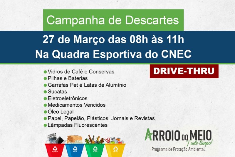 Arroio do Meio – O programa de proteção ambiental Arroio do Meio Tudo Limpo, promove no próximo sábado, dia 27 de março, a 38ª edição da Campanha de Descartes ambientalmente correto. A ação será realizada das 8h às 11h, na quadra de esportes do CNEC, em frente à Escola Estadual Guararapes em formato drive thru.
