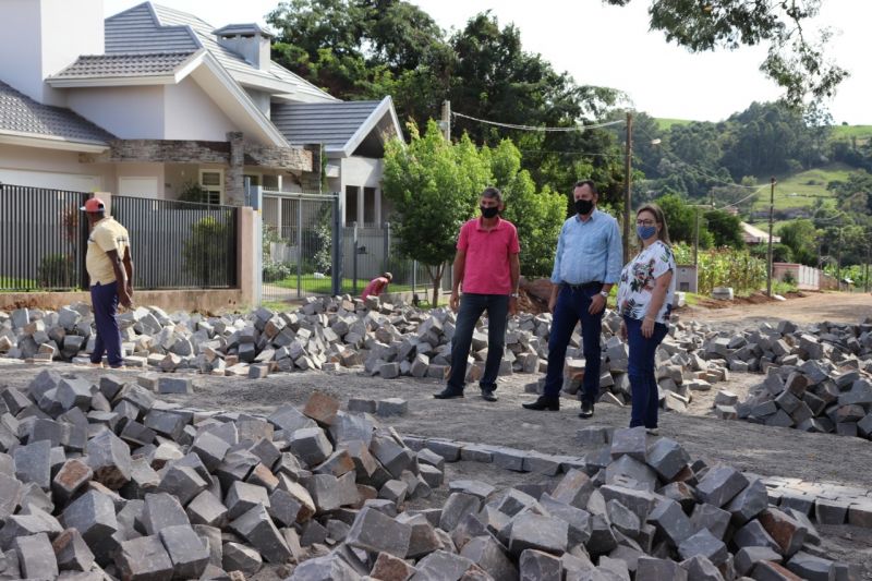 Na Olavo Bertholdo Trasel a colocação das pedras de basalto iniciou nesta semana. Serão 102 metros de extensão pavimentados, beneficiando seis lotes e uma área verde, sendo que a parte que corresponde à área verde é de responsabilidade do município.