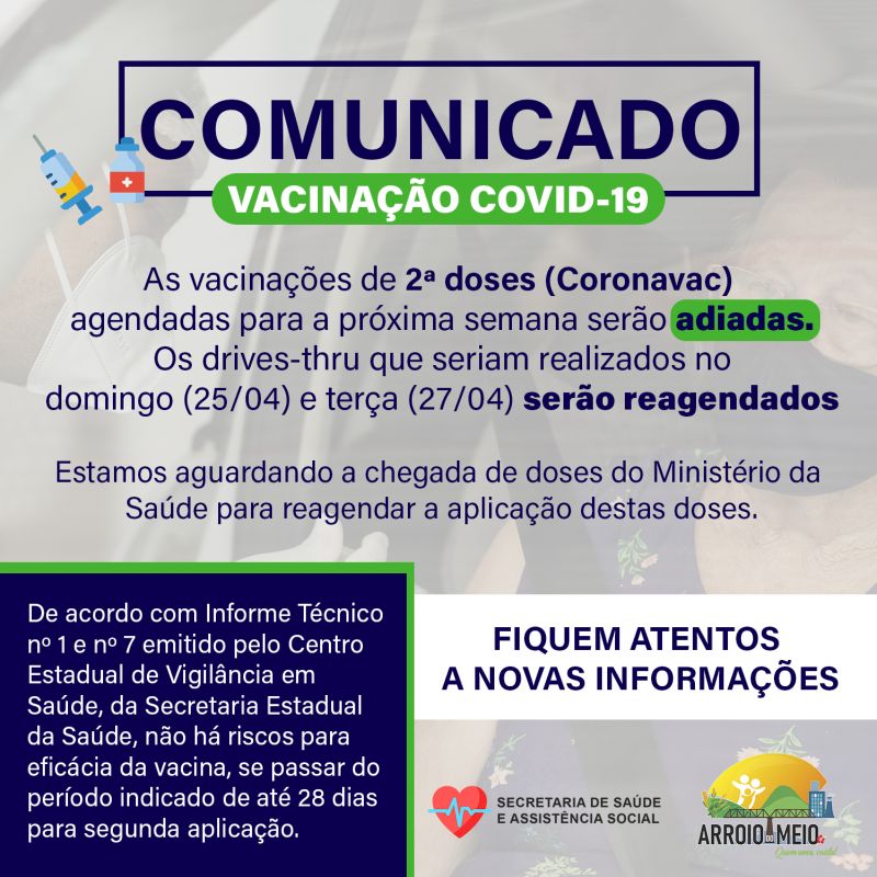 SEGUNDA DOSE AGENDADAS PARA DOMINGO(26/04) E TERCA-FEIRA(27/04) PARA VACINADOS SERÂO ADIADAS.