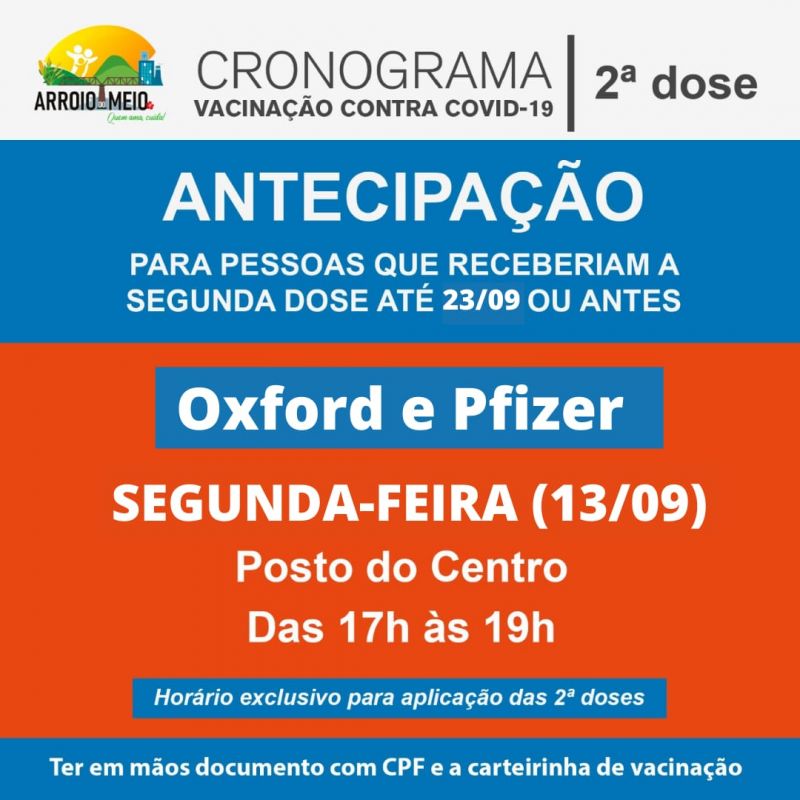2ª dose | Oxford e Pfizer pessoas que têm a segunda dose agendada para 23/09 ou antes.