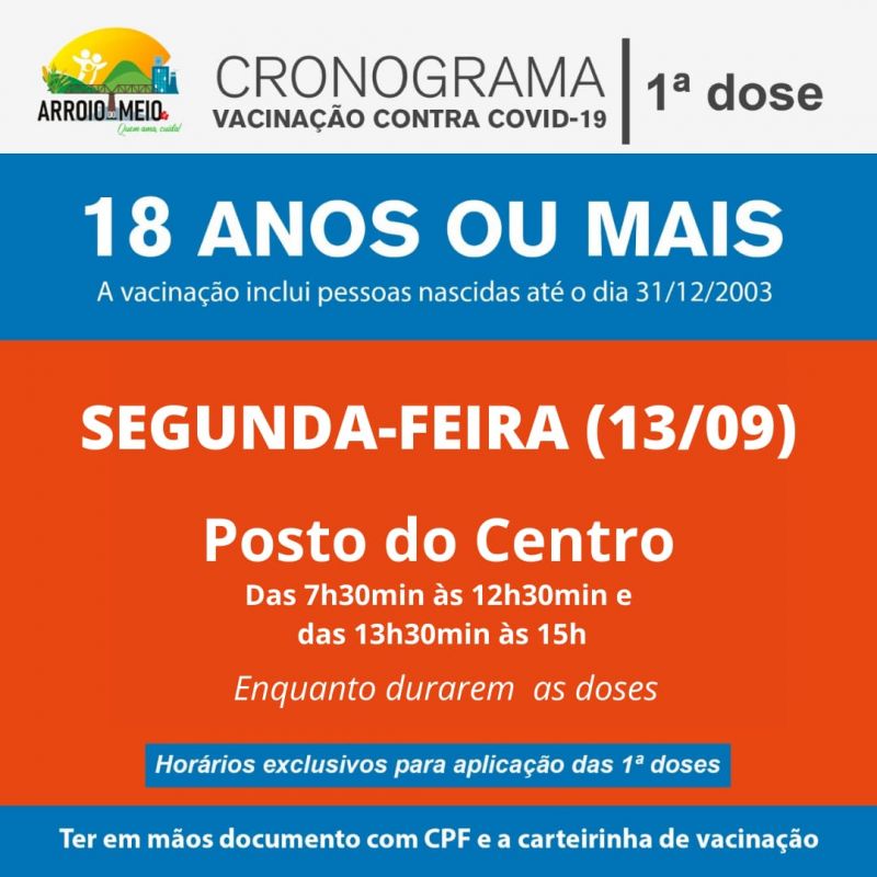 A vacinação continua nesta segunda-feira (13/09), com aplicação de 1ª doses e 2ª doses;