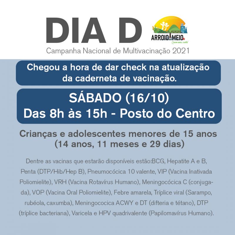 ARROIO DO MEIO – O município por meio da secretaria de Saúde realiza neste sábado, dia 16, o Dia D da Campanha Nacional de Multivacinação 2021. Com o objetivo de atualizar a caderneta de vacinas de crianças e adolescentes menores de 15 anos (14 anos, 11 meses e 29 dias), o Posto de Saúde do Centro estará aberto das 8h às 15h.