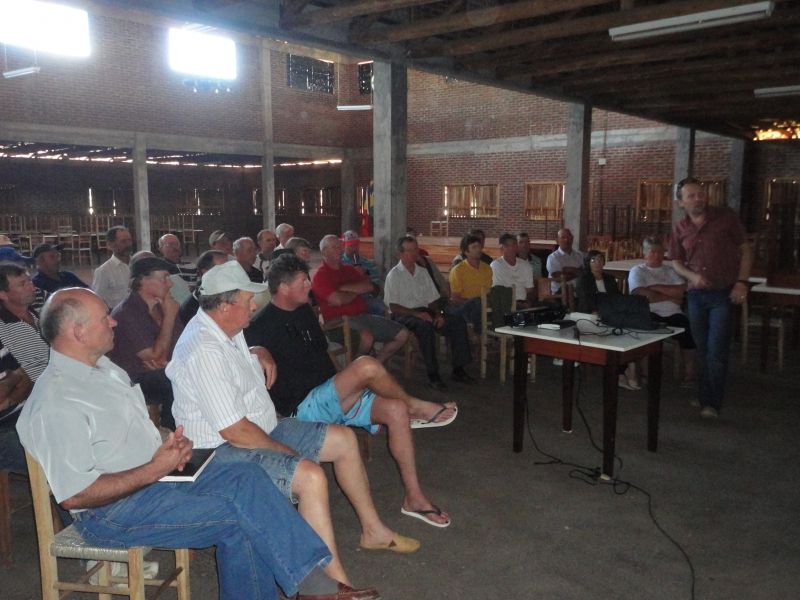 Cerca de 40 produtores rurais do município, inscritos no programa de pastagens permanentes, participaram de mais uma etapa de qualificação do Programa Leite Gaúcho, realizada na última quinta-feira, dia 18, no CTG Querência de Arroio do Meio. O encontro foi marcado pela palestra do técnico em agropecuária do escritório da ASCAR/EMATER/RS de Westfália, Marcelo Henrique Muller, que abordou o assunto de forma dinâmica com os participantes, mostrando imagens e repassando informações referentes ao processo de fenação, propriedades nutricionais, maquinários, qualidade da pastagem e benefícios para os bovinos. Ao meio-dia foi servido almoço aos produtores e à tarde os trabalhos continuaram com debates e participação dos presentes. A próxima etapa de formação ocorre dia 29 de novembro, por ocasião do 4º Seminário Municipal do Leite. O evento foi organizado pelo Escritório da ASCAR/EMATER-RS e Secretaria Municipal de Agricultura de Arroio do Meio. Legenda: Técnico em agropecuária falou sobre fenação e qualidade da pastagem para cerca de 40 produtores. Fotos: Maica Viviane Gebing Texto: Assessoria de Imprensa