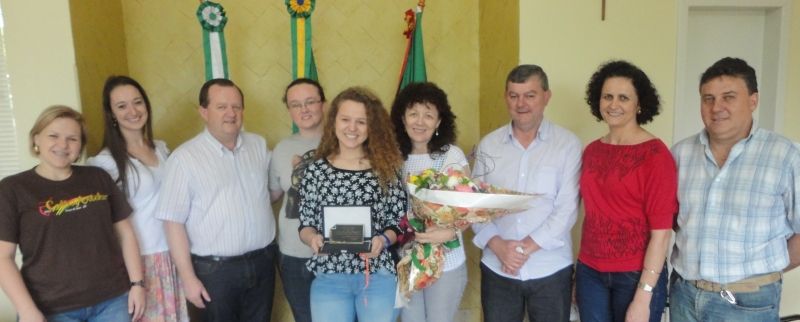 A administração municipal prestou uma homenagem à artista arroio-meense Betânia Bersch Delazeri na última segunda-feira, dia 29, no Gabinete do Executivo. Além de flores e uma placa de reconhecimento ao brilho da jovem cantora, palavras de orgulho e alegria fizeram parte do encontro que contou com a presença do Prefeito Sidnei Eckert, Secretários Municipais, amigos e familiares de Betânia. –É um orgulho muito grande para o município ter um talento como você levando o nome de Arroio do Meio para o Brasil. Estaremos sempre torcendo por ti–, afirmou Eckert. A jovem de 17 anos chegou ao município no último dia 26, quando foi recepcionada em clima de festa por amigos, familiares e fãs, após retornar de São Paulo, onde participou do programa musical Ídolos, da TV Record. Depois de desbancar 110 mil candidatos de todo o país, Betânia classificou-se entre os quinze finalistas do Programa, avaliada por jurados da emissora, que levaram em consideração o talento e a desempenho musical dos artistas. Antes de chegar em São Paulo, onde Betânia passou os últimos dias, a jovem participou de outras seletivas, incluindo a fase Estadual, realizada em Porto Alegre, onde disputou vaga com 11 mil cantores e classificou-se com mais quatro gaúchos. Betânia foi desclassificada numa fase decisiva do Programa, onde a votação do público contou como critério de permanência na casa. Saiba mais: A jovem professora de informática tem ligação com a música desde os primeiros anos de vida. Sua mãe, Clarice, dá aula de música para corais das escolas do município. Betânia ficou surpresa ao retornar para Arroio do Meio e ver a mobilização das pessoas em prol da sua permanência no programa, que tem como lema escolher o –novo ídolo do Brasil–. Um grupo criado por fãs e administrado pela sua irmã Suzana na rede social Facebook, soma mais de 23 mil pessoas que apoiaram e votaram pela permanência da artista arroio-meense no programa. E para quem já está com saudades da voz marcante da cantora, Betânia afirma que já começou a organizar um show de agradecimento aos seus apoiadores. Local e data devem ser divulgados nos próximos dias. Legenda: Cantora arroio-meense foi homenageada pela administração municipal. Fotos: Maica Viviane Gebing Texto: Assessoria de Imprensa
