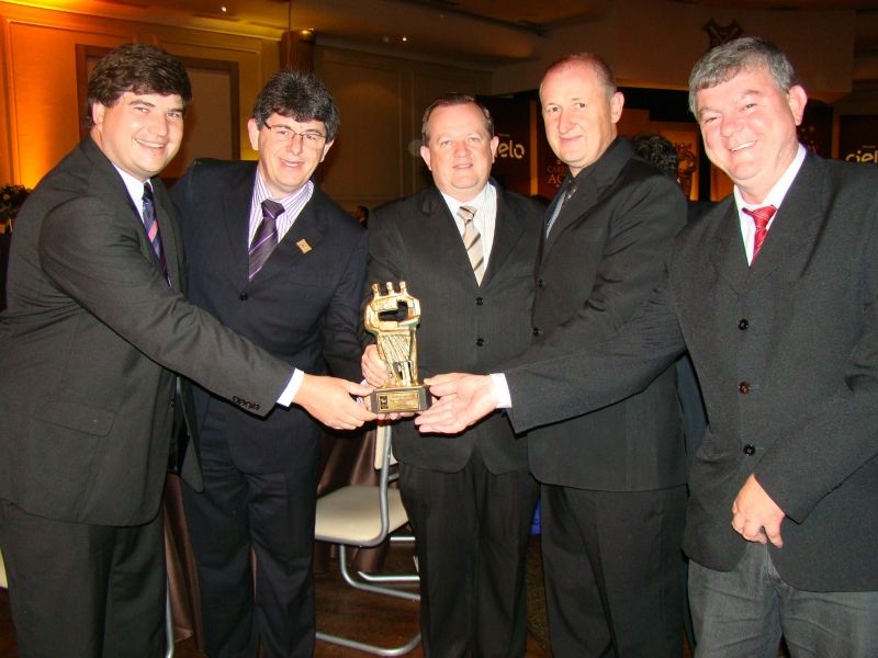 O Prefeito Sidnei Eckert, o atual vice Klaus Werner Schnack e o vice-prefeito eleito Áurio Scherer estiveram no Grêmio Náutico União, em Porto Alegre, na noite da última segunda-feira, dia 26, onde acompanharam a 29ª edição do Carrinho Agas, evento organizado pela Associação Gaúcha de Supermercados (Agas). Na ocasião, a empresa arroio-meense de produtos de limpeza Girando Sol, recebeu pela 15º vez o troféu Carrinho Agas – categoria Fornecedora de Produtos de Limpeza. A Girando Sol tem 21 anos de atuação no mercado de produtos de limpeza e prepara-se para transferir as suas linhas de produção, atualmente divididas em três prédios diferentes, para a nova planta industrial em construção no bairro São Caetano. Ao todo serão 22 mil m² de área construída, num investimento de R$ 40 milhões. A empresa conta atualmente com 350 colaboradores e um portfólio de 150 produtos comercializados nacional e internacionalmente. A projeção, segundo Borscheid, é de ampliar em 25% a 35% a linha de produtos, o que atualmente é impossível devido ao espaço físico limitado. Legenda: Representantes da administração municipal comemoram com o Diretor da Girando Sol, Gilmar Borscheid e Gerente Comercial César Borscheid. Fotos: Divulgação Texto: Assessoria de Imprensa