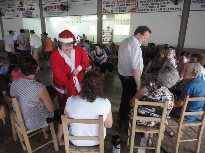 Uma comitiva coordenada pelo Prefeito Sidnei Eckert e Mamãe Noel Adiles Meyer, participou essa semana dos encontros de confraternização de final do ano de quatro grupos da Terceira Idade do município. Estiveram presentes também a coordenadora dos grupos de Terceira Idade, Ilse Thomas, secretários e vereadores representantes das comunidades visitadas. Até o Natal, a administração municipal contemplará os 20 grupos de Terceira Idade do município, presenteando cerca de 1.600 idosos com uma lembrança. O principal objetivo, segundo a coordenadora Ilse, é resgatar e despertar o espírito natalino entre os grupos, aproveitando a ocasião para homenagear os idosos de Arroio do Meio. A administração municipal, através do Executivo e assessores, saúda a todos os idosos do município nesta passagem de ano, agradecendo pela contribuição que cada um tem dado às suas comunidades e ao município ao longo de suas lutas e conquistas vivenciadas. E deseja também, que 2013 seja um ano repleto de saúde, alegrias, paz e harmonia a todos! Legenda: Prefeito Sidnei Eckert e Mamãe Noel entregaram presentes aos idosos. Fotos: Divulgação Texto: Assessoria de Imprensa
