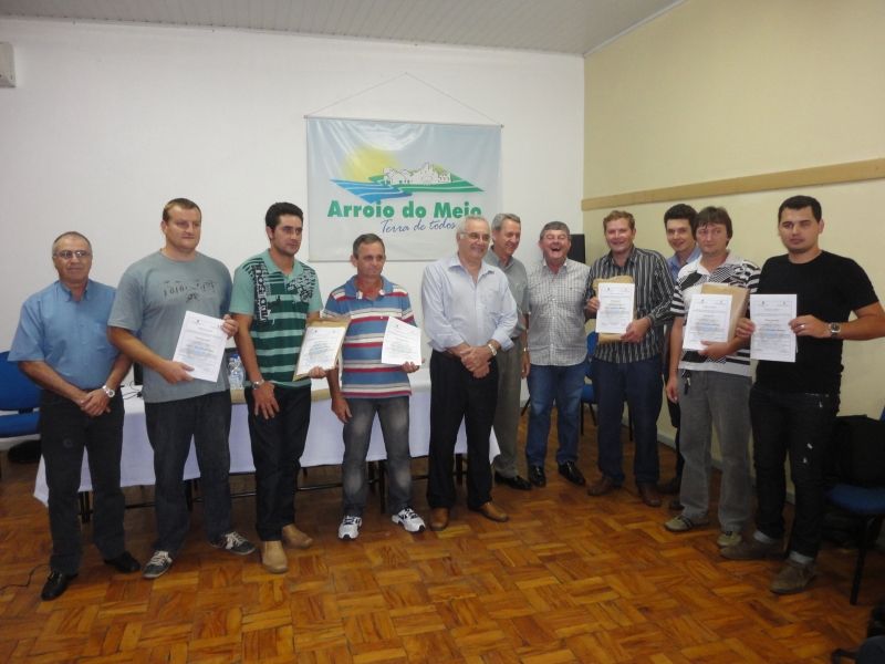 Arroio do Meio sediou na última quarta-feira, dia 23, uma reunião promovida pelo Ministério de Agricultura, Pesca e Abastecimento (Mapa), para tratar sobre questões do Programa de Sanidade Animal. O encontro realizado nas dependências da Secretaria de Educação e Cultura contou com a presença do Prefeito de Arroio do Meio, Sidnei Eckert, vice-prefeito Áurio Scherer, Prefeito de Coqueiro Baixo, Veríssimo Caumo, servidores responsáveis pelo Programa nos municípios, veterinários e secretários municipais da Comarca, além de representantes do Mapa e do Fundo de Desenvolvimento e Defesa da Sanidade Animal (Fundesa). O principal foco do encontro foi a busca por soluções para a agilização da burocracia necessária para a liberação dos certificados que atestam as propriedades livres de brucelose e tuberculose. Também, os presentes aproveitaram para esclarecer dúvidas referentes ao Programa, trocar informações entre os municípios, levantar possíveis falhas e apontar sugestões para o aprimoramento do Programa e reversão do investimento em lucro real para o produtor. Ao final do encontro foram entregues 587 certificados do Programa, dos quais 388 para Arroio do Meio, em aprovação às propriedades rurais do município pioneiro no programa. Nova Bréscia, Capitão, Coqueiro Baixo, Pouso Novo e Travesseiro também receberam certificados. Legenda: Representantes dos municípios da Comarca recebem certificados de propriedades livres de brucelose e tuberculose. Fotos: Maica Viviane Gebing Texto: Assessoria de Imprensa
