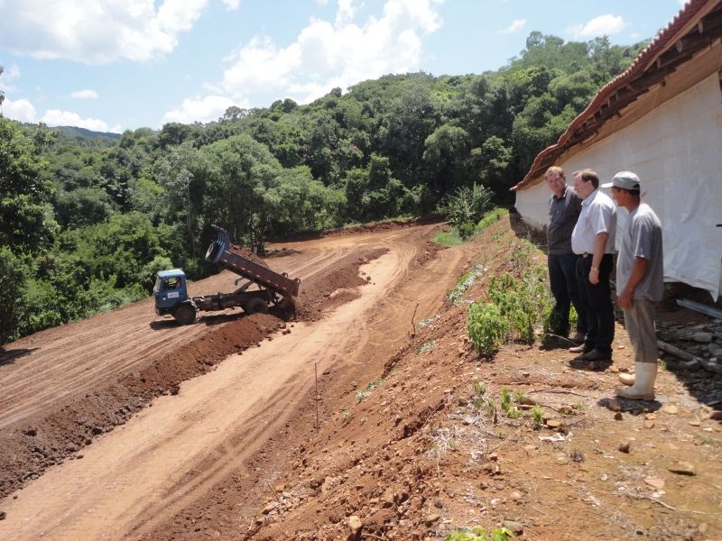A Secretaria de Agricultura trabalhou na última semana na execução de terraplenagem na propriedade do produtor Vilson Backes, na localidade de Canudos/ Linha 32. No local estão sendo construídos três pavilhões para a implantação de aviários para a criação de 30 mil galinhas poedeiras. De acordo com um dos colaboradores do empreendedor, a obra será finalizada em março, somando mais de 420 metros de construção. A produção diária deve chegar a 27 mil ovos. O tempo de permanência destas galinhas nos aviários é de 10 meses, quando são substituídas por uma nova remessa. A granja local é considerada a matriz, já que os ovos produzidos na localidade seguem para o incubatório, onde é dada a seqüência ao processo. Para dar conta da demanda, o empreendedor conta com 13 funcionários. O Secretário de Agricultura, Paulo Heck, afirma que a administração municipal concede diferentes formas de incentivo a empreendimentos locais, visando a diversificação da economia do município e o crescimento do setor primário. –Olhamos o interior do município como um todo, executando melhorias de infraestrutura em geral, em busca de melhores condições das estradas, saúde, telefonia, internet, energia elétrica e outros, como forma de incentivar a permanência do jovem no campo para dar seqüência e promover o crescimento do setor e das comunidades do interior–, destaca Heck. Legenda: Prefeito Sidnei Eckert e Secretário de Agricultura Paulo Heck acompanharam serviço de terraplenagem executado na granja. Fotos: Maica Viviane Gebing Texto: Assessoria de Imprensa