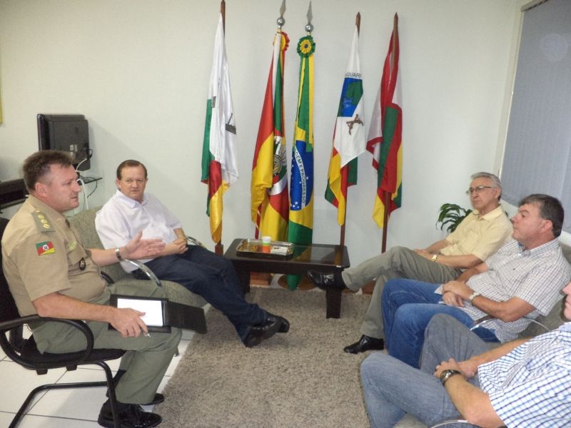 O Prefeito Sidnei Eckert e o vice Áurio Scherer estiveram na última semana no Comando Regional de Polícia Ostensiva (CRPO) de Lajeado, onde reuniram-se com o Comandante Antônio Scussel. O encontro solicitado pela administração municipal foi pautado pelo pedido do reforço no efetivo da Brigada Militar de Arroio do Meio. Atualmente o CRPO está com 32 novos policiais em treinamento em Lajeado que, após formados, irão reforçar a segurança da Região. Uma das justificativas dos chefes de governo para o reforço do efetivo no município, é a presença de um presídio no bairro Bela Vista, onde a Brigada Militar atua com vigilância. Legenda: Prefeito Eckert, vice Scherer e representantes de entidades do município em reunião com Comandante do CRPO. Fotos: Divulgação Texto: Assessoria de Imprensa