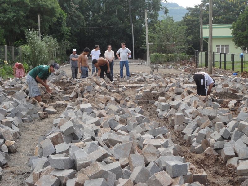 Cerca de 50% do calçamento da Rua das Rosas, no Loteamento Antares, bairro Bela Vista, está concluído. A rua é conhecida por ser o endereço da unidade de Estratégia de Saúde da Família (ESF) Bela Vista. A obra dá continuidade às pavimentações de vias públicas e está sendo realizada sob os moldes de pavimentação comunitária, que prevê a parceria entre o poder público e os moradores locais no pagamento da mesma. Ao todo serão 2.168,31m² de pavimentação com revestimento de pedras regulares de basalto, 386 metros de meio-fio de concreto moldado e 152 metros de rede de drenagem. O investimento é de R$ 118.177,34. A obra está sendo executada pela Cooperativa dos Mineradores de Capitão Ltda, empresa vencedora de processo licitatório. O prazo inicial de término era de três meses, porém, a obra deve ser entregue nas próximas semanas, caso as condições do tempo permitirem. De acordo com o Secretário de Planejamento, Henrique Meneghini, outras obras de pavimentação estão previstas para este ano e as prioridades serão definidas a partir de reuniões comunitárias realizadas entre administração municipal e moradores dos bairros e localidades do município. Legenda: Prefeito Sidnei Eckert, Secretário Meneghini e engenheiro Aldir de Bona vistoriam a obra. Fotos: Maica Viviane Gebing Texto: Assessoria de Imprensa