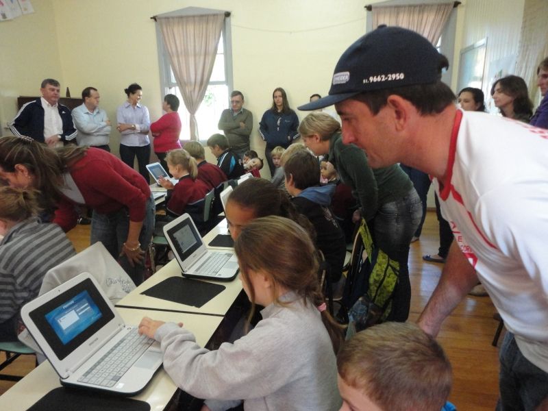 Com olhares curiosos, atentos e alegres, os 17 alunos da Escola Municipal Getúlio Vargas, da localidade de Passo do Corvo/ Cascalheira, receberam netbooks individuais para fins de estudo, na manhã dessa terça-feira, dia 16. Inserida no Programa do Governo Federal Pronacampo/ Escola da Terra, desde 2011, a escola multisseriada recebeu o equipamento por meio do Programa Um Computador por Aluno (ProUCA). A Escola atende alunos de quatro a onze anos, que freqüentam desde o Nível A até o 5º ano. No ato da entrega, a Secretária de Educação e Cultura, Eluise Hammes, demonstrou a sua satisfação em ver os pais presentes na ocasião, participando ativamente da vida escolar dos filhos. –É muito importante para a educação de nossas crianças cultivarmos essa parceria entre a família e a escola–, destacou. O Prefeito Sidnei Eckert reforçou a importância da manutenção das escolas no meio rural, fortalecendo a cultura e o desenvolvimento de cada localidade. –Aderimos ao programa viabilizado pelo Governo Federal, para manter as raízes e incentivar o progresso das comunidades do interior. Graças a esse programa estamos vivendo essa alegria hoje–, afirmou Eckert. Pai da aluna Ethieli Schneider, do 2º ano, Carlos acompanhou atento a filha manuseando o seu novo material escolar. –Acho muito importante manter a escola do interior ativa–, e complementou: –A informática é indispensável nos dias atuais–. Ethieli resumiu o seu sentimento em poucas palavras escritas na tela do seu netbook: –Eu estou feliz–, assim como Sabrina Schuster, do 3º ano, que também foi objetiva nas palavras para descrever seu sentimento diante da novidade: –Muito feliz!–. De acordo com a Secretaria de Educação, o ProUCA pretende criar e socializar novas formas de utilização das tecnologias digitais nas escolas, ampliar o processo de inclusão digital escolar e promover o uso e a apropriação pedagógica das novas tecnologias de informação e comunicação como uma nova linguagem. Legenda: Pais participaram do ato de entrega de netbooks e acompanharam atentos as primeiras orientações para o manuseio dos aparelhos. Fotos: Maica Viviane Gebing Texto: Assessoria de Imprensa
