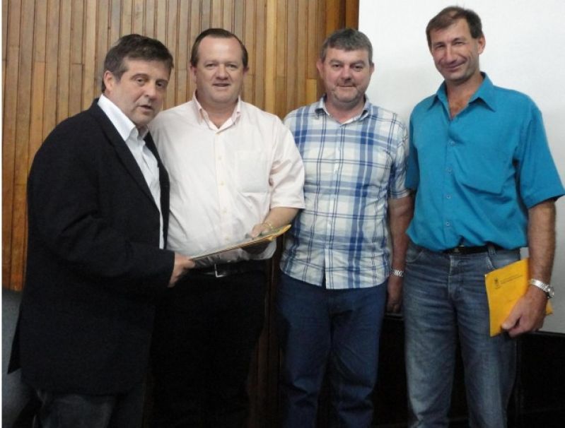 R$ 100 mil em recursos do Programa de Correção de Solo foram garantidos para o município na quinta-feira, dia 26 de janeiro, quando o Prefeito Sidnei Eckert, o Secretário de Agricultura, Paulo Grassi e o líder local, Áureo Scherer, foram recebidos no Ministério da Agricultura, Pecuária e Abastecimento (MAPA), em Porto Alegre, onde o Ministro Mendes Ribeiro Filho assinou o contrato de repasse do benefício. O recurso será utilizado para a implantação de 150 hectares de pastagens permanentes. A medida de incentivo já havia sido discutida no Conselho Arroio-meense de Desenvolvimento Rural (CONAR). –Nosso objetivo é proporcionar melhorias e incrementar a produção leiteira do município, gerando alimento a um baixo custo de produção–, explica o Secretário Grassi. O Programa vem acompanhado de um projeto de aquisição de dois conjuntos para a produção de feno, o que facilita o armazenamento de forragem para a complementação do alimento do rebanho leiteiro. O Prefeito Eckert atribui a boa relação com o Governo Federal, em especial com o Ministro Mendes, para a conquista de diversos recursos em benefício do município. Além desta conquista, já estão empenhados os projetos que prevêem a vinda de R$ 500 mil para dar continuidade ao asfalto da Estrada Geral de Arroio Grande, uma retroescavadeira, uma patrola, um caminhão e dois conjuntos de fenação novos. Existem também boas perspectivas para trazer ao município projetos de pavimentações asfálticas para o Interior, conforme prevê um programa que está iniciando dentro do Ministério da Agricultura. Legenda: Prefeito Sidnei Eckert, Secretário de Agricultura, Paulo Grassi e líder local, Áureo Scherer, junto ao Ministro Mendes Ribeiro Filho. Fotos: Maica Viviane Gebing Texto: Assessoria de Imprensa