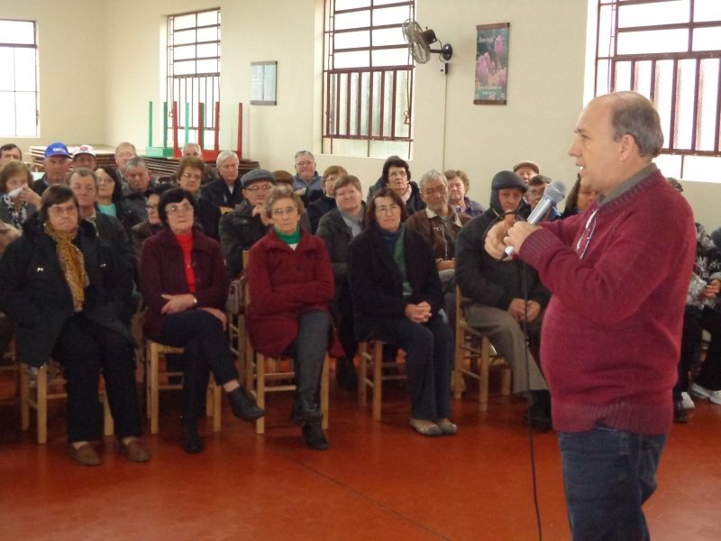 Mais de 100 idosos participaram da 2ª Conferência Municipal do Idoso, realizada no último dia 26, nas dependências da Comunidade Luterana São Paulo. O evento iniciou com a apresentação de coreografias do grupo de dança sênior, seguido do pronunciamento do Prefeito Sidnei Eckert, que relembrou o histórico e a evolução das atividades voltadas à Terceira Idade nas últimas duas décadas, ressaltando a importância do envolvimento dos idosos nas mesmas, para um envelhecimento de qualidade. O Coordenador Estadual da Terceira Idade, Dionísio Kuchinski, deu sequência ao encontro, abordando questões e tirando dúvidas sobre o Conselho do Idoso e a criação do Fundo Municipal do Idoso. Após, os idosos foram divididos em grupos, quando tiveram a oportunidade de discutir sobre os programas, projetos, serviços, ações, atividades, participação e gestão relacionados à Terceira Idade do município. De acordo com a Coordenadora Municipal dos grupos, Noely Herrmann, a participação dos idosos nas discussões foi expressiva, atingindo o objetivo do evento, em estimular o idoso a opinar e reivindicar sobre sua situação na sociedade. –Esta é a oportunidade do idoso manifestar seus projetos, ideias e vontades, para que o município possa avançar em prol da Terceira Idade–, afirma. Legenda: Coordenador Estadual da Terceira Idade manteve a atenção dos idosos. Fotos: Maica Viviane Gebing Texto: Assessoria de Imprensa