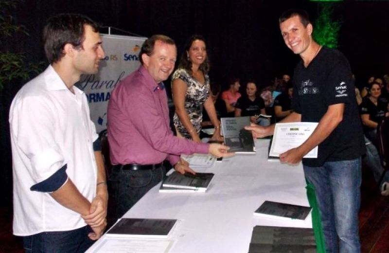 Num clima de muita alegria e emoção, 40 alunos dos cursos de Auxiliar Administrativo e Operador de Computador formaram-se na noite da última sexta-feira, 28, no auditório Irmã Nísia – Colégio Bom Jesus. Formandos do Programa Nacional de Acesso ao Ensino Técnico e Emprego (Pronatec), os alunos receberam o diploma após 180 horas de qualificação, distribuídas em aulas bissemanais iniciadas em outubro passado. O evento organizado pela administração municipal Terra de Todos Nós, iniciou com uma salva de palmas aos formandos, que foram conduzidos ao palco por seus professores paraninfos. Após saudação aos presentes e execução do hino nacional, foram entregues os certificados aos alunos. Na sequência, os oradores das turmas fizeram discursos emocionados, onde agradeceram a oportunidade e a dedicação dos professores e demais envolvidos. Os professores paraninfos das turmas também deixaram suas mensagens, enaltecendo o comprometimento dos alunos. A diretora do Senac/Lajeado, Etiene Azambuja, salientou a qualidade da infraestrutura oferecida pela administração municipal para a realização dos cursos. –Quando educação, cultura e boa vontade andam juntos, temos este resultado–, elogiou. O Prefeito Sidnei Eckert destacou a importância de parcerias para a realização de bons projetos. –A vocês formandos, nosso parabéns e muito obrigado por terem aproveitado tão bem essa oportunidade. Com certeza saem daqui mais preparados para a vida pessoal e profissional. Vocês são a razão de todo o nosso esforço–, finalizou. O Coral Municipal - COMAM abrilhantou o evento, apresentando canções do seu repertório. Mais três cursos estão previstos para iniciar durante o mês de abril. As inscrições podem ser feitas no Centro de Referência da Assistência Social (CRAS) – rua Gustavo Wienandts, nº 485, para interessados em se qualificar como Cuidadores de Idosos, Auxiliar de Recursos Humanos e Vendedor. Ao todo serão ofertadas 80 vagas gratuitas. A prioridade é voltada aos usuários do Programa Bolsa Família e Cadastro Único. Legenda: Alunos emocionados recebem o certificado do curso. Fotos: Maica Viviane Gebing Texto: Assessoria de Imprensa