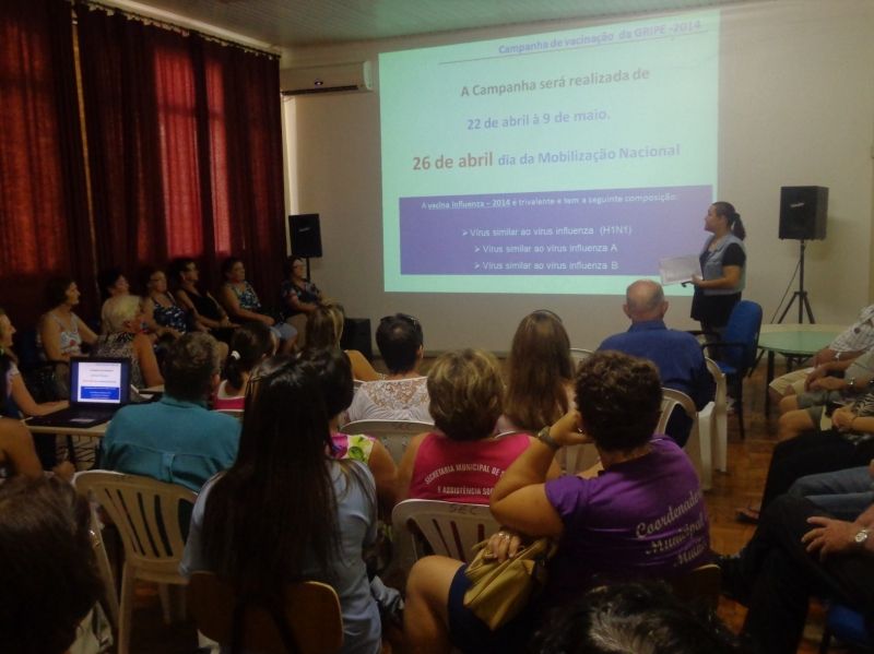 A campanha nacional de vacinação contra gripe deste ano será realizada no período de 22 de abril a 9 de maio, sendo sábado, 26, o dia de mobilização nacional, quando todos os postos de saúde ficam abertos das 8h às 17h para imunização. A novidade deste ano é a ampliação da faixa etária para crianças de seis meses a menores de cinco anos. Antes apenas crianças menores de dois anos recebiam a vacina. Estas e outras informações foram repassadas em encontro realizado na tarde dessa quarta-feira, dia 2, no Cineclube Real. Na ocasião, enfermeiros da Secretaria Municipal de Saúde esclareceram dúvidas sobre a campanha para idosos do município. Segundo a Secretária de Saúde, Helena Matte, o intuito do encontro é reforçar a importância da vacinação na Terceira Idade. Participaram ainda do encontro agentes de saúde do município. O principal objetivo da Campanha, de acordo com a enfermeira Lisete Berwanger, é reduzir a mortalidade e as complicações em decorrência do vírus influenza. Para vacinar o maior número de pessoas entre os grupos prioritários, a equipe da saúde montou estratégias que incluem visitas aos grupos e lar de idosos para aplicação da vacina, vacinação em todos os postos (Central e ESFs Bela Vista, Aimoré e Navegantes) no período de campanha, visita domiciliar a idosos acamados, horário de atendimento nos postos de saúde estendido até às 19h nos dias 25 de abril e 2 de maio e envio de material explicativo às escolas. Conforme dados da Secretaria de Saúde, 123 casos foram notificados em 2013 na 16ª Coordenadoria Regional da Saúde. Destes, 18 foram confirmados como Influenza A H1N1, dos quais quatro foram a óbito, sem ter aplicado a vacina. Em Arroio do Meio, 2.529 idosos foram vacinados em 2013. SAIBA MAIS: **QUEM SÃO OS GRUPOS DE RISCO – QUE TÊM DIREITO À VACINA– - Idosos com 60 anos ou mais; Trabalhadores da área da saúde; Portadores de doenças crônicas, mediante prescrição médica atualizada; Crianças de 6 meses a menores de 5 anos; Gestantes; Mulheres que tiveram bebê em até 45 dias; Indígenas; Detentos. **CONTRA INDICAÇÕES: - Pessoas que têm alergia a ovo e a outro componente da vacina não devem fazê-la. Legenda: Enfermeira Lisete esclareceu dúvidas dos idosos sobre a campanha. Fotos: Maica Viviane Gebing Texto: Assessoria de Imprensa