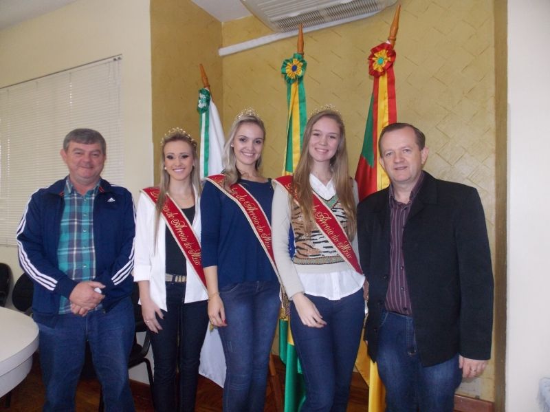 A Rainha do Município, Aline Dummel Conrad, 23, esteve no Gabinete do Executivo nessa quarta-feira, dia 23, acompanhada das princesas Tainá Guillante, 18 e Vanessa Schneider, 20. No local, foram recepcionadas pelo Prefeito Sidnei Eckert, vice Áurio Scherer e Dirigente Municipal de Cultura, Angelica Diefenthaler. O trio de soberanas foi eleito no último dia 13 e representará o município no biênio 2014/2015, com uma agenda especial neste ano, quando Arroio do Meio comemora 80 anos de emancipação. O encontro marcou o primeiro evento oficial das Soberanas, que receberam a premiação estabelecida no regulamento do concurso, incluindo oficinas de Dicção, Oratória e Etiqueta, oferecidas pela Gold Excelência Humana e Empresarial e atendimento personalizado com dicas de cabelo e maquiagem na loja Affinitá. Além disso, compartilharam a emoção e a experiência do título recém conquistado. Neste domingo, dia 27, o trio participa da Rústica da Solidariedade, promovida pelo Rotary Club Arroio do Meio, com apoio da administração municipal e patrocinadores. A Rainha Aline é moradora da Barra da Forqueta e Pós Graduada em Supervisão Escolar. A 1ª Princesa Tainá cursa a faculdade de Engenharia Química e mora em São Caetano. Já a 2ª Princesa Vanessa mora em Forqueta Baixa e cursa Pedagogia. Legenda: Reinado das novas soberanas iniciou oficialmente com visita ao Prefeito Eckert e vice Scherer. Fotos: Maica Viviane Gebing Texto: Assessoria de Imprensa