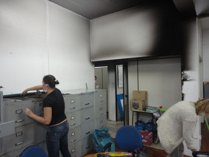 A Prefeitura Municipal comunica à comunidade arroio-meense que, em virtude do princípio de incêndio ocorrido na noite dessa quinta-feira, dia 15, na Secretaria de Planejamento, alguns atendimentos estão temporariamente comprometidos. O sinistro foi registrado num bebedouro elétrico, utensílios plásticos e papéis próximos ao aparelho. Embora o fogo não tenha se alastrado, a queima gerou muita fuligem, que espalhou-se por todas as repartições dos dois andares do prédio. Suspeita-se de descarga elétrica ou curto circuito no aparelho, tendo em vista o temporal ocorrido na cidade. Serviços e solicitações voltadas ao setor de meio ambiente, engenharia e projetos seguem suspensos até a metade da próxima semana, em virtude do estado precário destas repartições, materiais de trabalho e documentos que estavam no local, ocasionados pelo excesso de fuligem. A administração municipal agradece a compreensão da comunidade e afirma que está agilizando os serviços de limpeza e desintoxicação do prédio, para normalizar o mais rápido possível os atendimentos. Legenda: Secretaria de Planejamento foi a mais afetada com o sinistro. Fotos: Maica Viviane Gebing Texto: Assessoria de Imprensa